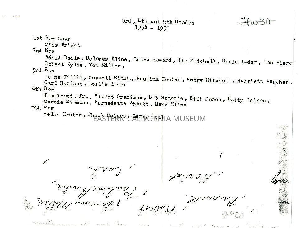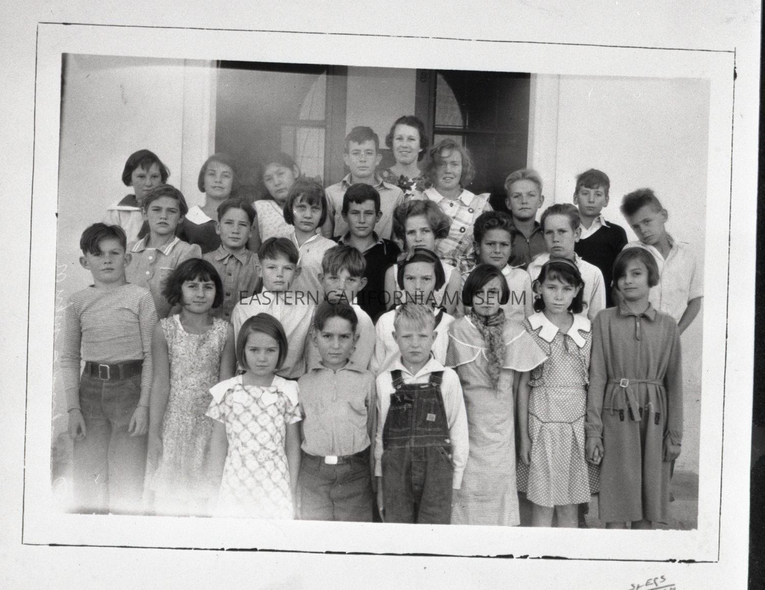 Negative of a class photo of 3rd, 4th, and 5th grade students at Owens Valley School in the 1934-1935 school year. The photographer was Specs of Tonopah, NV.