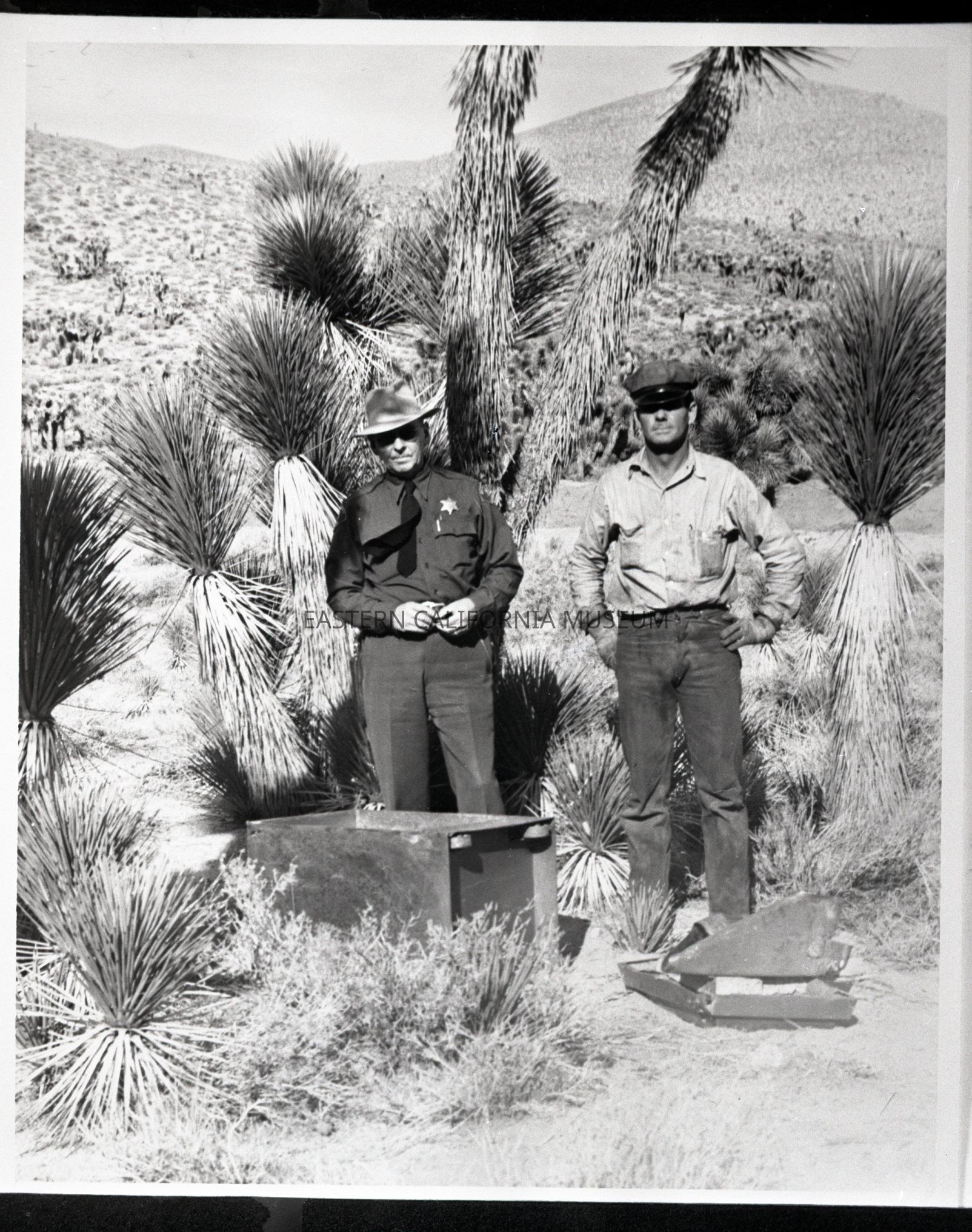 Negative of two men, one of whom is wearing a Sheriff Officer's uniform and badge and has been identified as Art Jewett, standing next to the remains of a safe in the desert with yucca trees in the background.