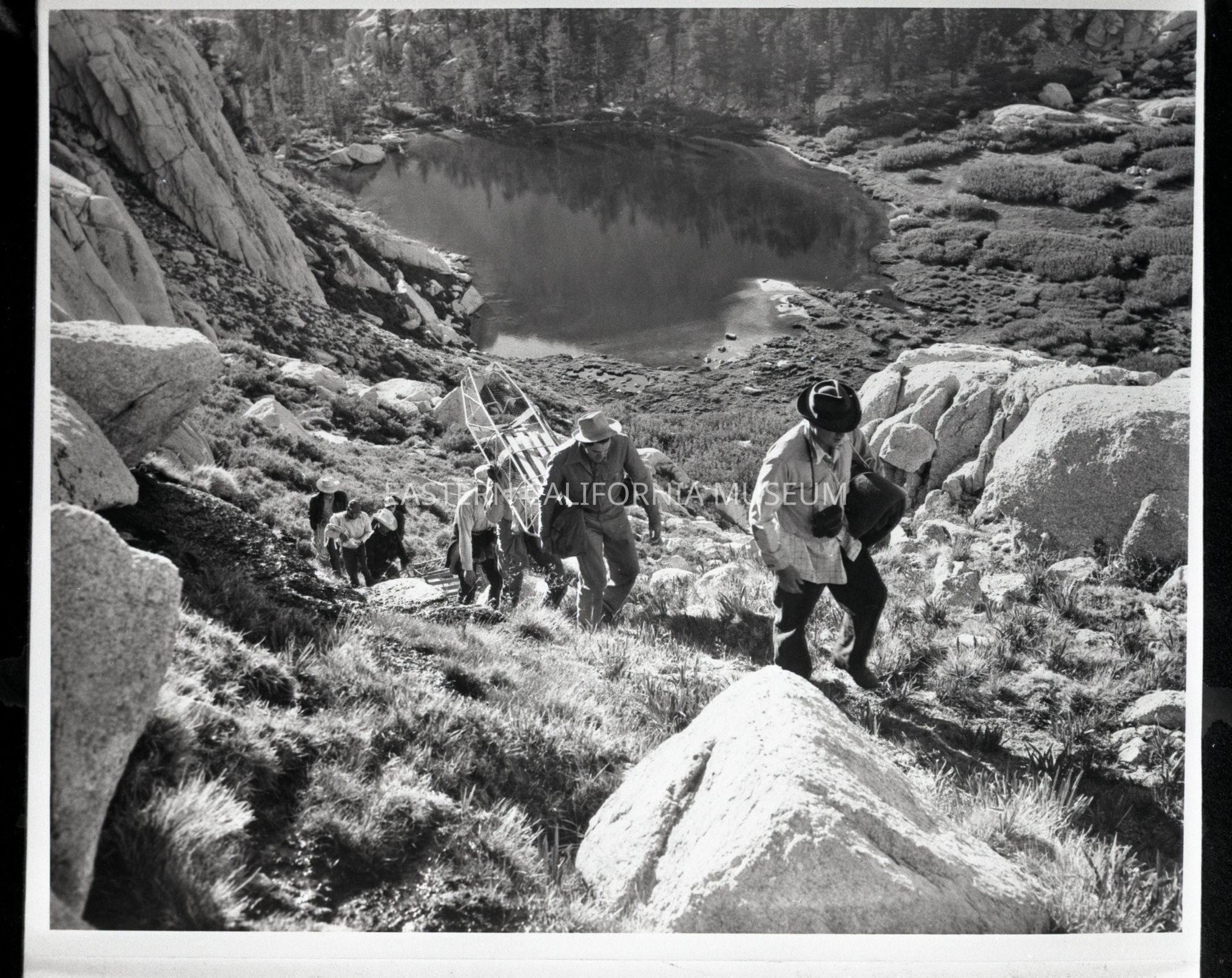This photo was taken in the 1950s, maybe 1956. It shows a rescue party on their way to two boys who had fallen while climbing Mt. Whitney. The boys were sons of rich people in Los Angeles and there was lots of media coverage.