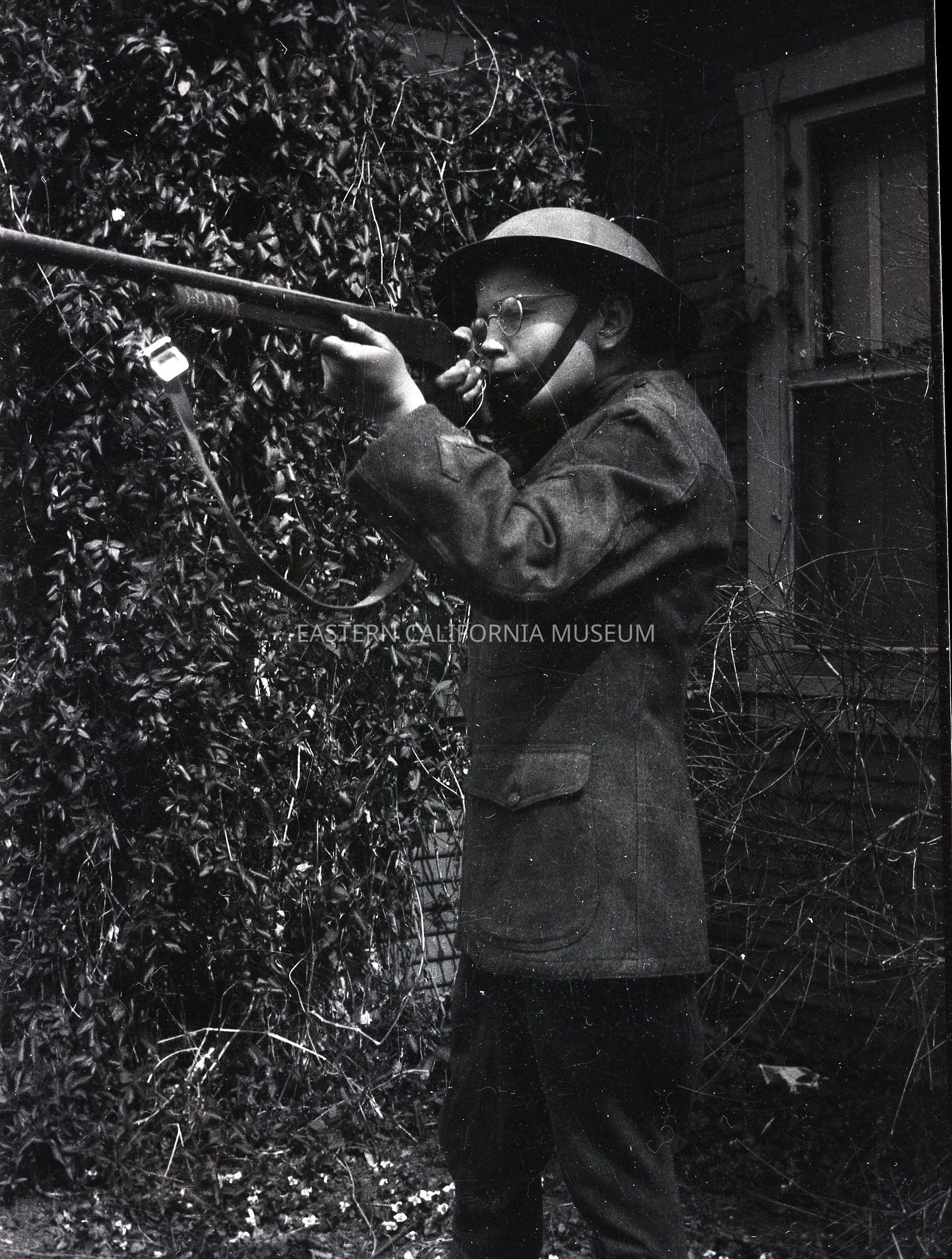 Negative of an unidentified boy with glasses dressed up like a soldier with a metal helmet (with chin strap) and jacket with military insignia near cuff. He is sighting a rifle.Collection