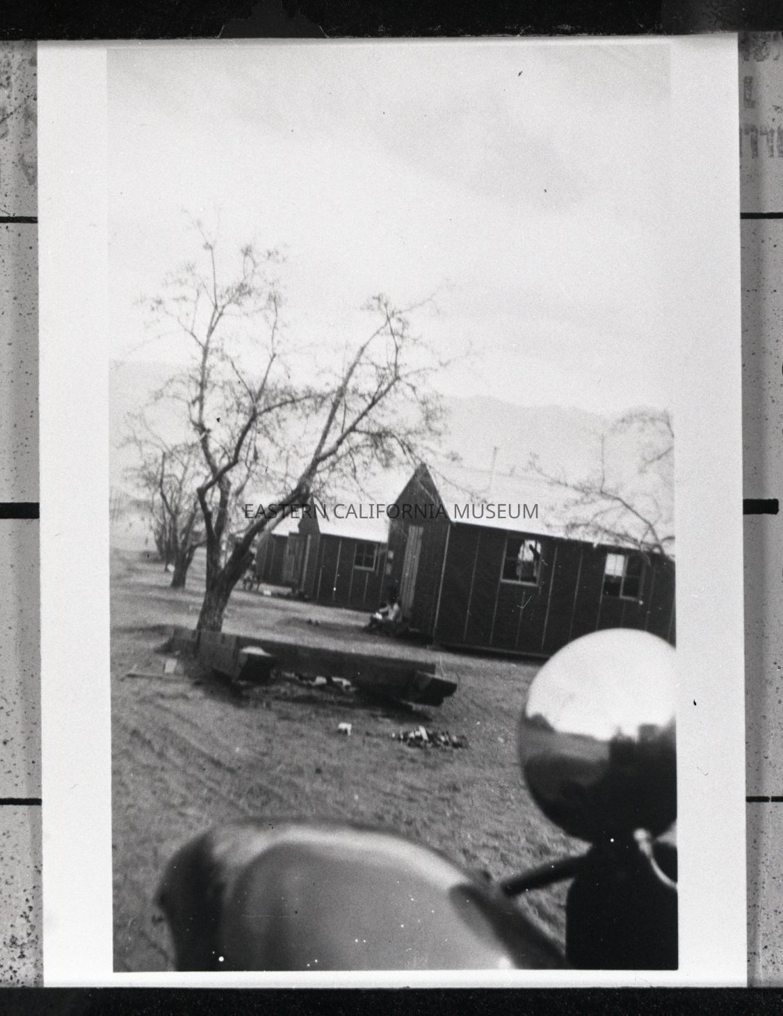 Negative of a row of barracks and trees at Manzanar War Relocation Center. The photo captures part of a vehicle in the foreground.Photograph Details