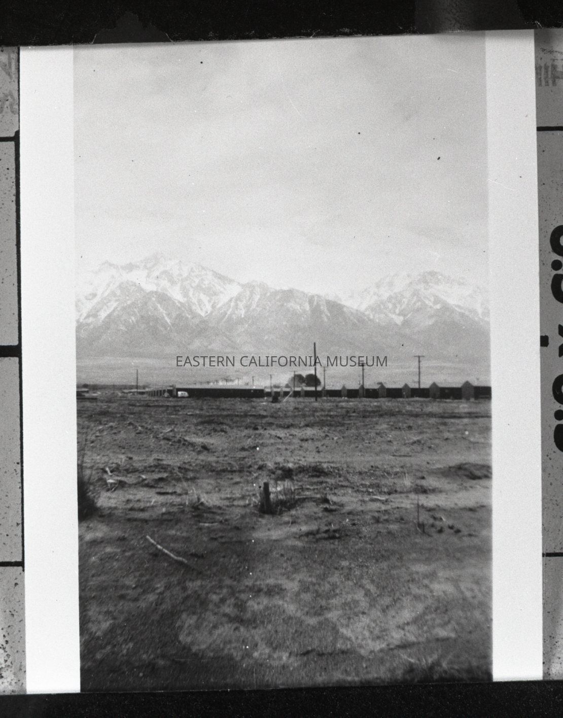 Negative of rows of barracks at Manzanar War Relocation Center looking west towards the Sierra Nevada mountain range.Photograph Details