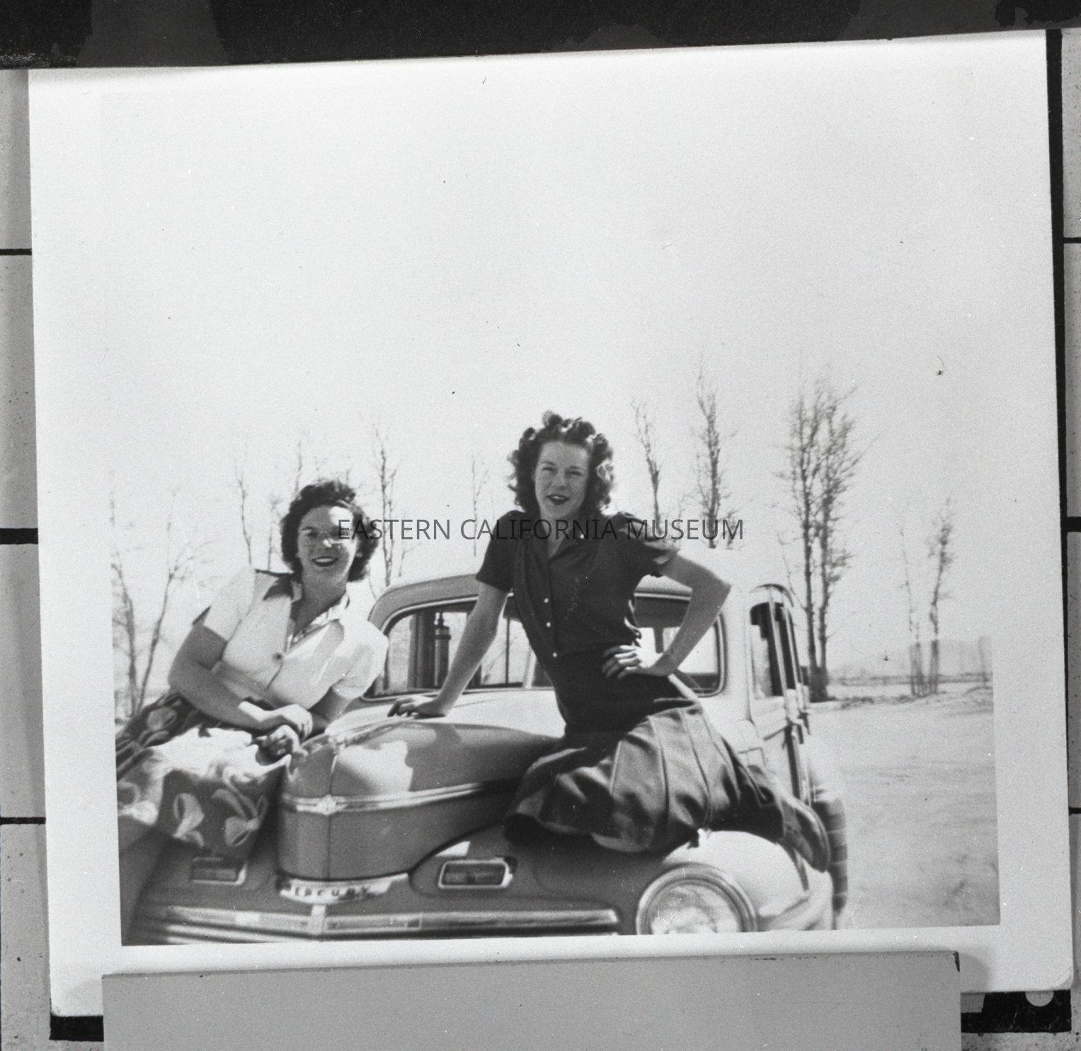 Negative of two women sitting on the hood or fenders of a vehicle. They are identified as Betty Haines Jewett and Billie Embry, The location is Manzanar War Relocation Center, and it was taken on 03/06/1943.Photograph Details