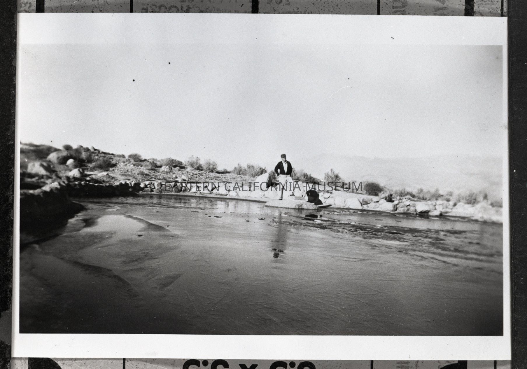 Negative of a man who has been identified as Gus Mellin standing next to the reservoir at Manzanar War Relocation Center, 1945.Photograph Details