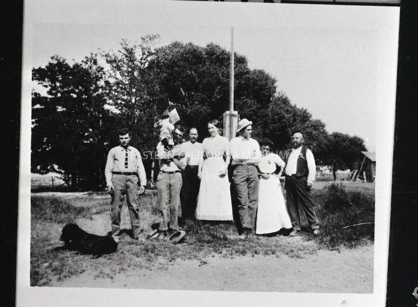 A negative made for the museum of a photo of a group of people outside on the 4th of July in Olancha. The man on the far right is tenatively identified as Webb [Webster?] Walker.Collection
