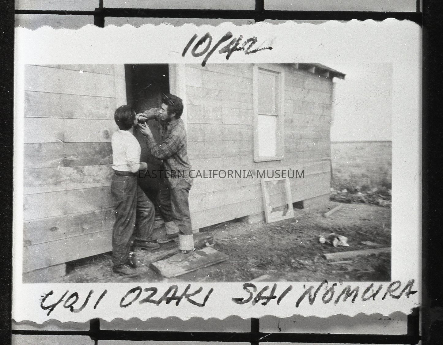 Negative of Shi Nomura and Yoji Ozaki in Idaho or Conrad, Montana in October 1942. They are working on the doorway of a wooden building.