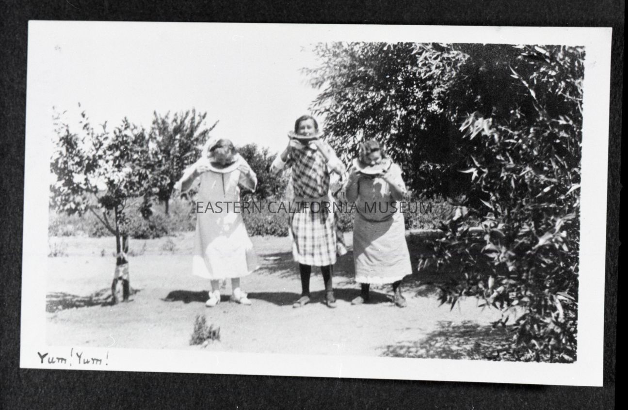 Photo taken of a photo in an album. It is of three women eating huge slices of watermelon outside. Someone has written along the bottom edge of the photo, "Yum! Yum!" Location may be Manzanar.