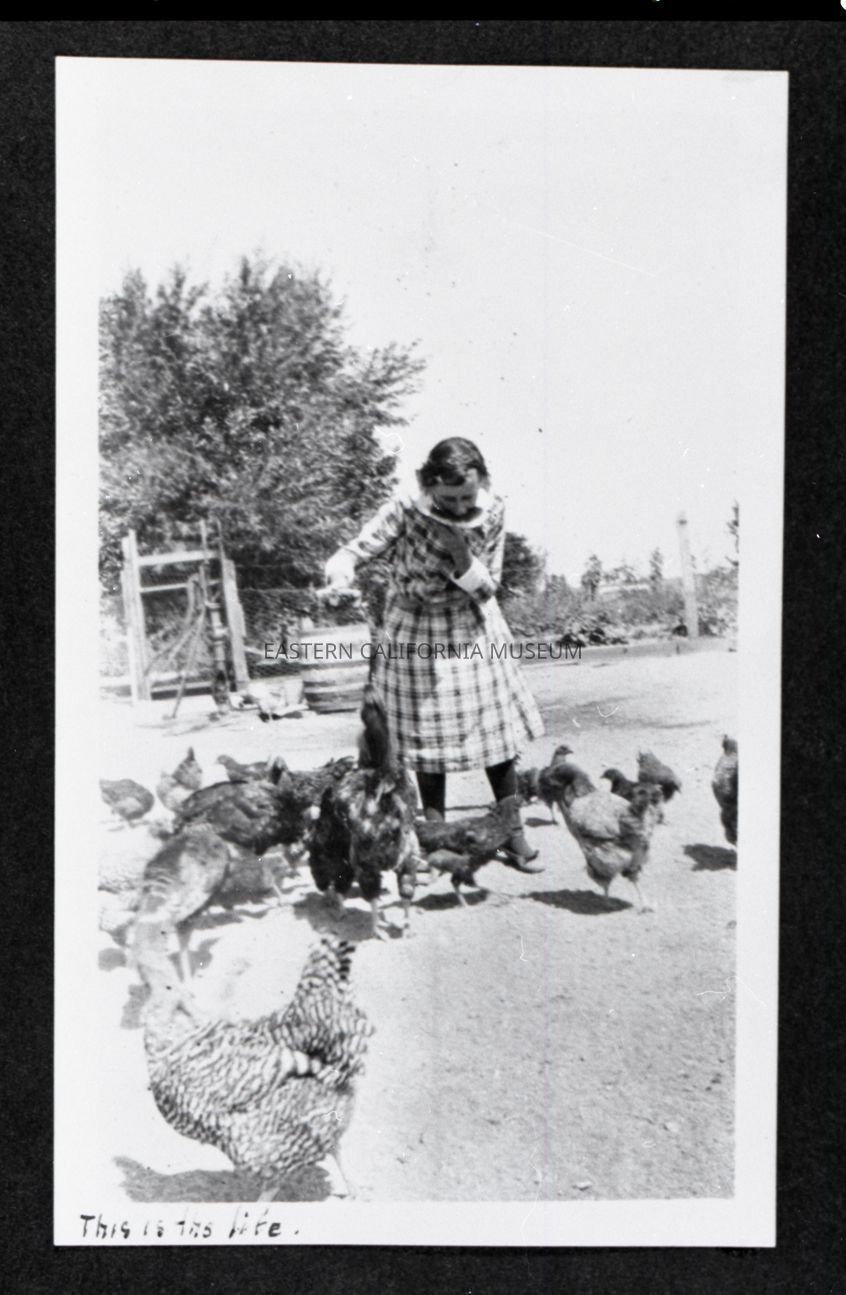 Photo taken of a photo in an album. It is of a woman eating a huge slice of watermelon outside while holding a feed bucket for the chickens around her feet. Someone has written along the bottom edge of the photo, "This is the life." Location may be Manzanar.