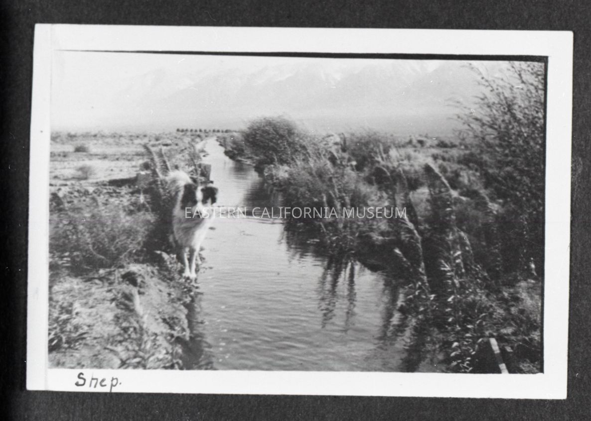Photo taken of a photo in an album. It is of a dog standing by the side of a canal or irrigation ditch filled with water. The Sierra Nevada mountain range is in the background. Someone has written along the bottom edge of the photo, "Shep." Location may be Manzanar.