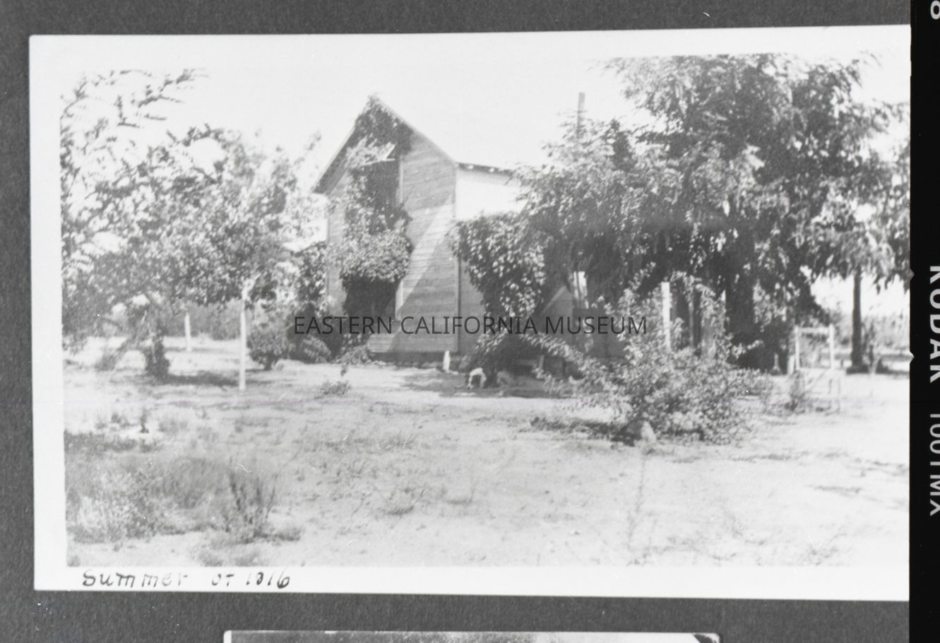 Photo taken of a photo in an album. It is of a two story ranch house surrounded by trees. A dog is sleeping in the center of the photo (possibly "Shep"). Someone has written along the bottom edge of the photo, "Summer of 1916." Location may be Manzanar.