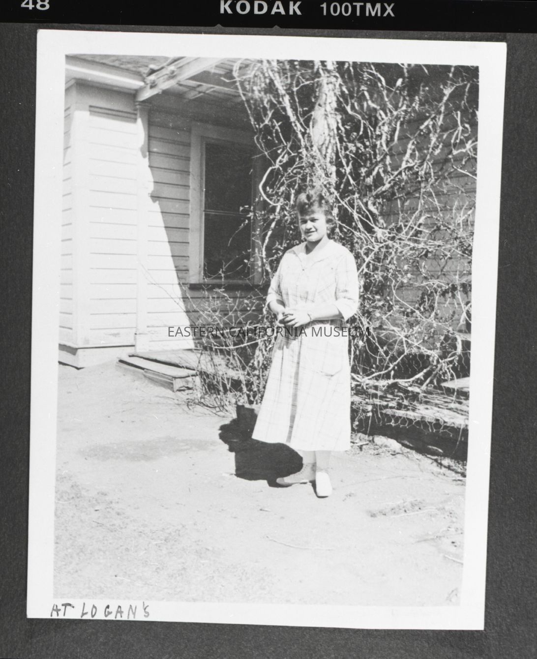 Photo taken of a photo in an album. It is of a woman standing in front of the house and porch with vines growing up it in 2024.0.103. Someone has written along the bottom edge of the photo, "At Logan's."