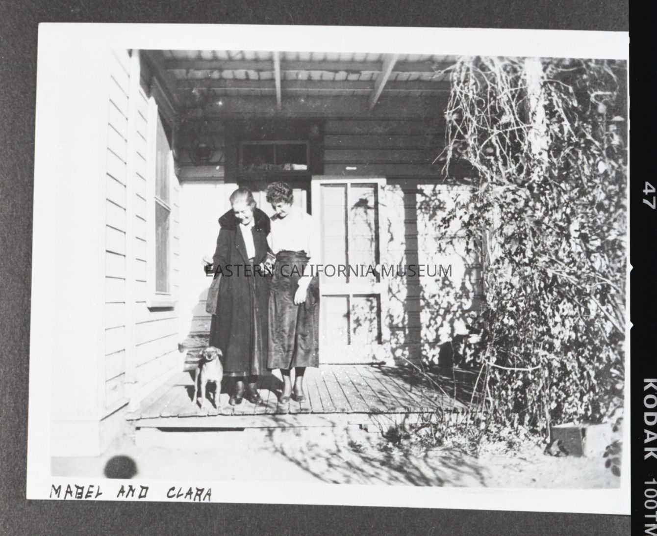Photo taken of a photo in an album. It is of two women standing on the front porch of a house with a little dog. There are vines growing up a post on the right side of the photo. Someone has written along the bottom edge of the photo, "Mabel and Clara."