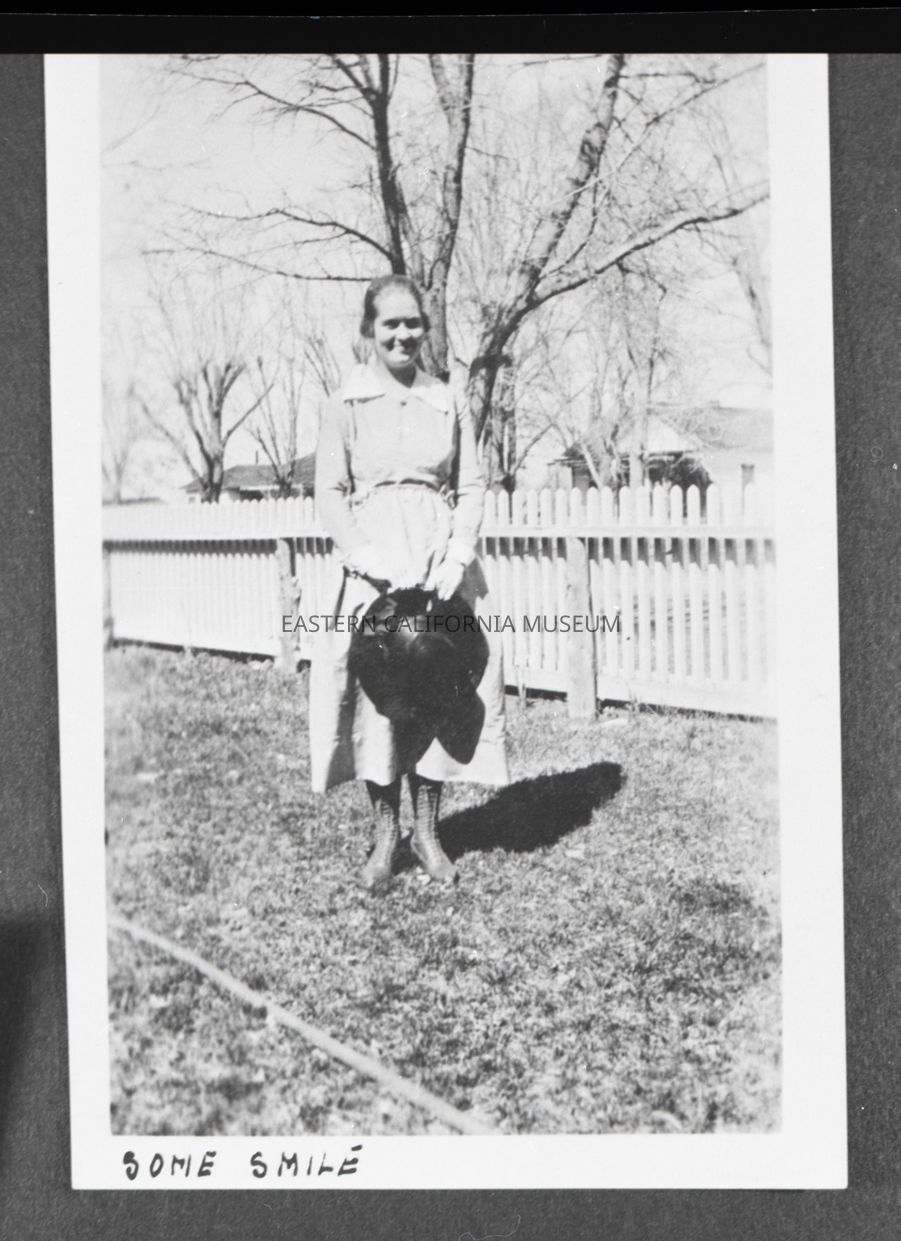 Photo taken of a photo in an album. It is of a young woman standing in a grassy lawn in front of a white picket fence. There are houses behind her and trees. Someone has written along the bottom edge of the photo, "Some smile." Location may be Independence.