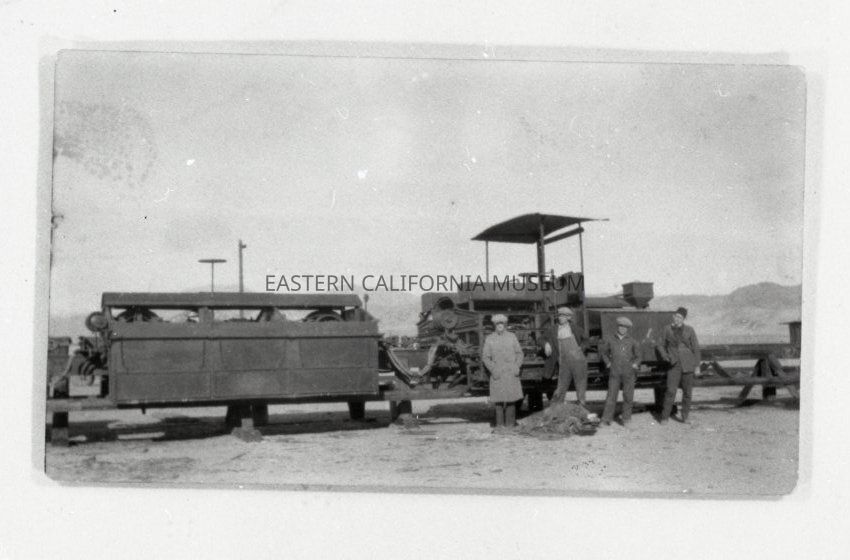 Monorail--Magnesium Mine. Trona, 1925. Go up one day and back the next, 100 miles. Balance themselves, men jump if they tilt too much.