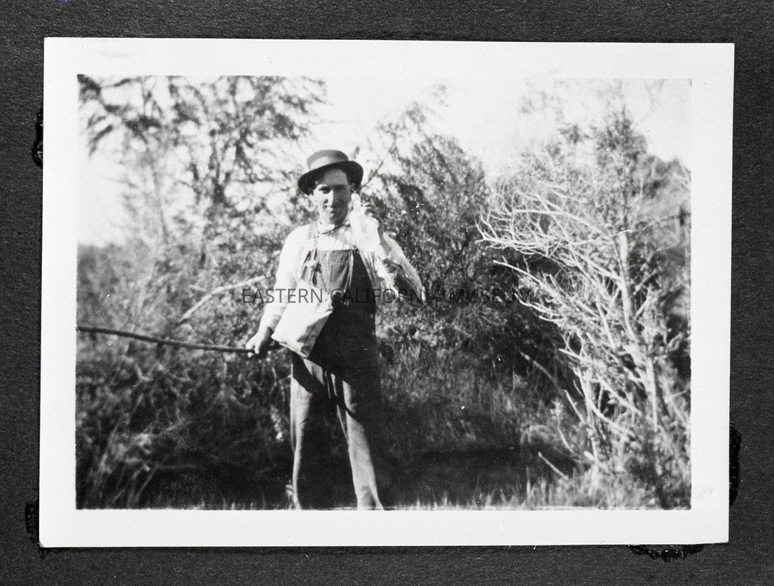 Photo taken of a photo in an album. It is of a man (likely Walter Levy) with a fishing pole in one hand, a bottle in the other, and a bag hanging around his neck.