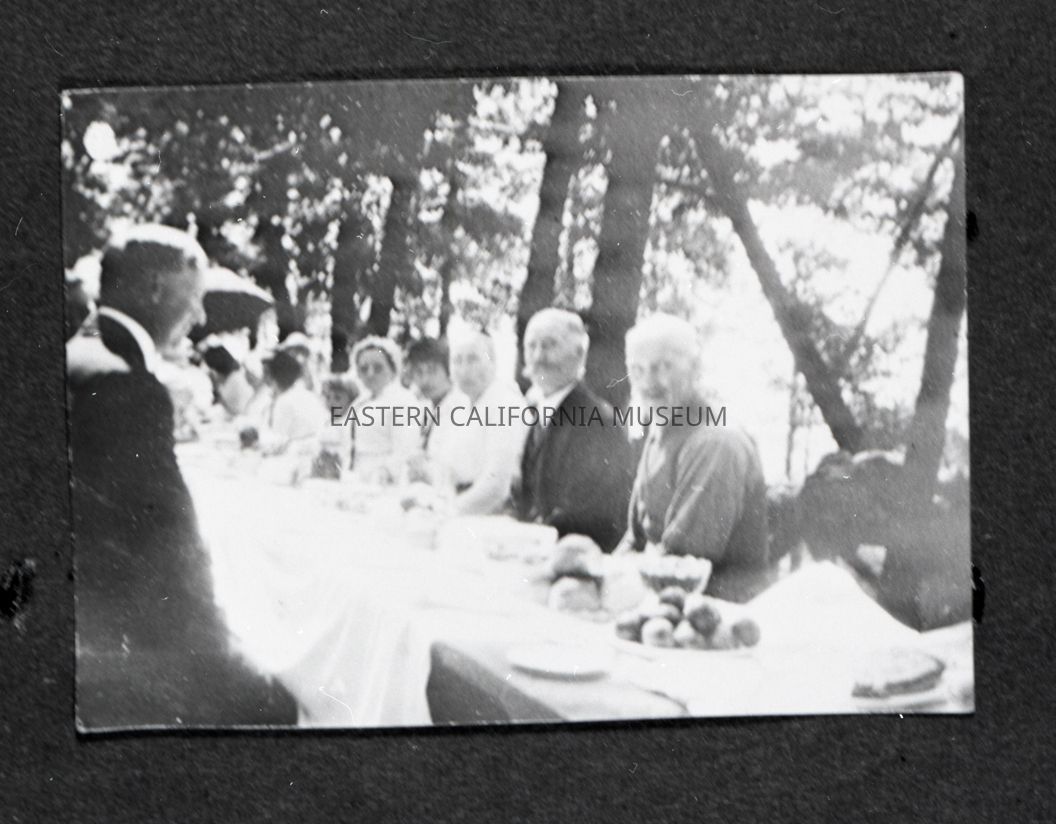 Photo taken of a photo in an album. It is of a group of people sitting at a long table outside amid tall trees. No IDs, but they may be members of the Levy or Singlaub families. Perhaps a wedding or holiday?