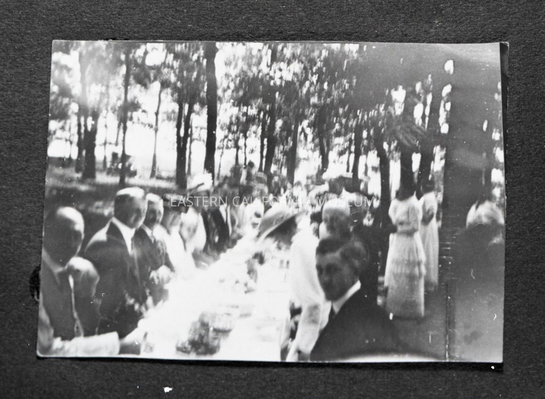 Photo taken of a photo in an album. It is of a group of people sitting at a long table outside amid tall trees. No IDs, but they may be members of the Levy or Singlaub families. Perhaps a wedding or holiday?