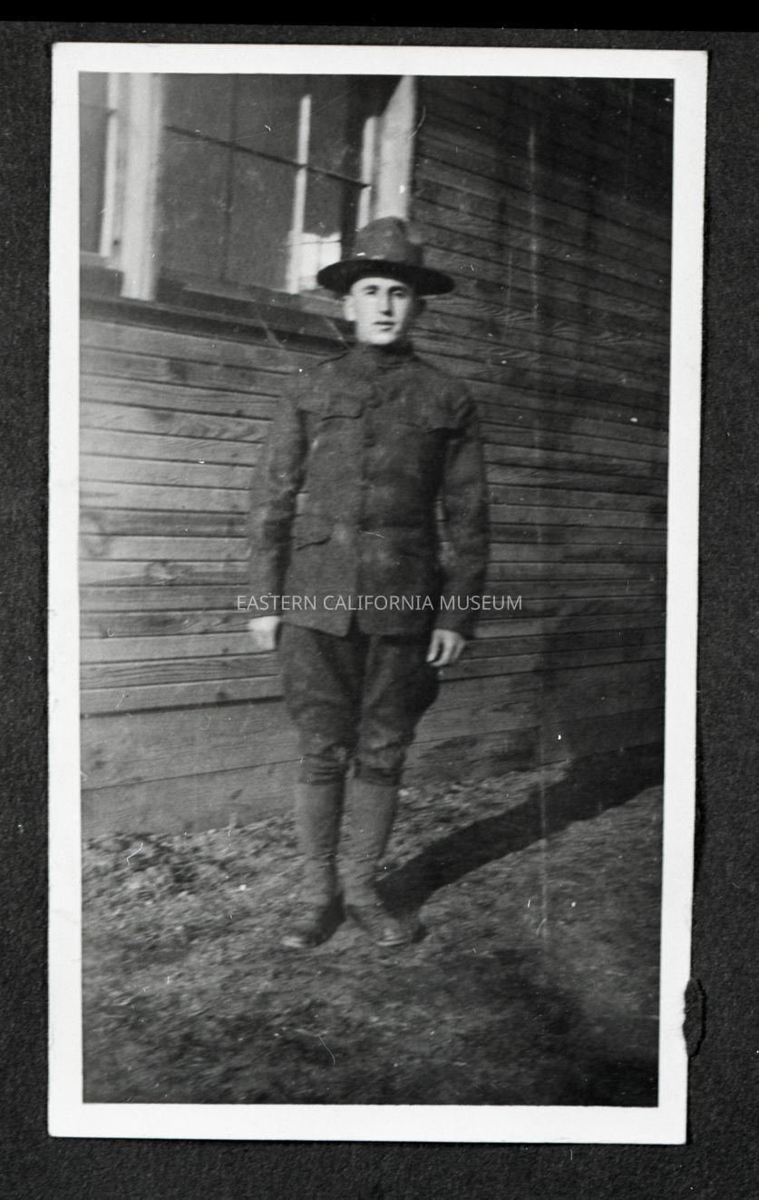 Photo taken of a photo in an album. It is of a young man wearing a WWI military uniform. He may be a member of the Levy or Singlaub families.