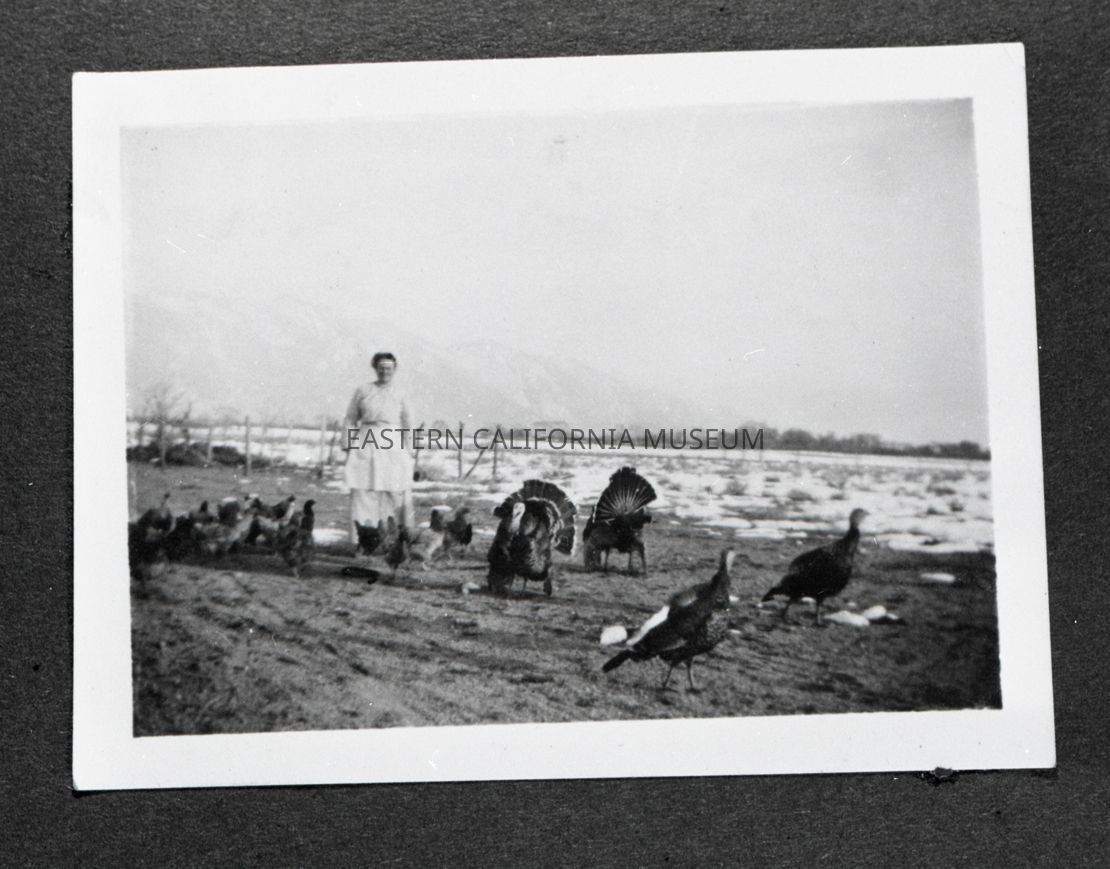 Photo taken of a photo in an album. It is of a woman feeding turkeys on a ranch. There is snow on the ground and mountains in the background. She may be Adda B. Singlaub.