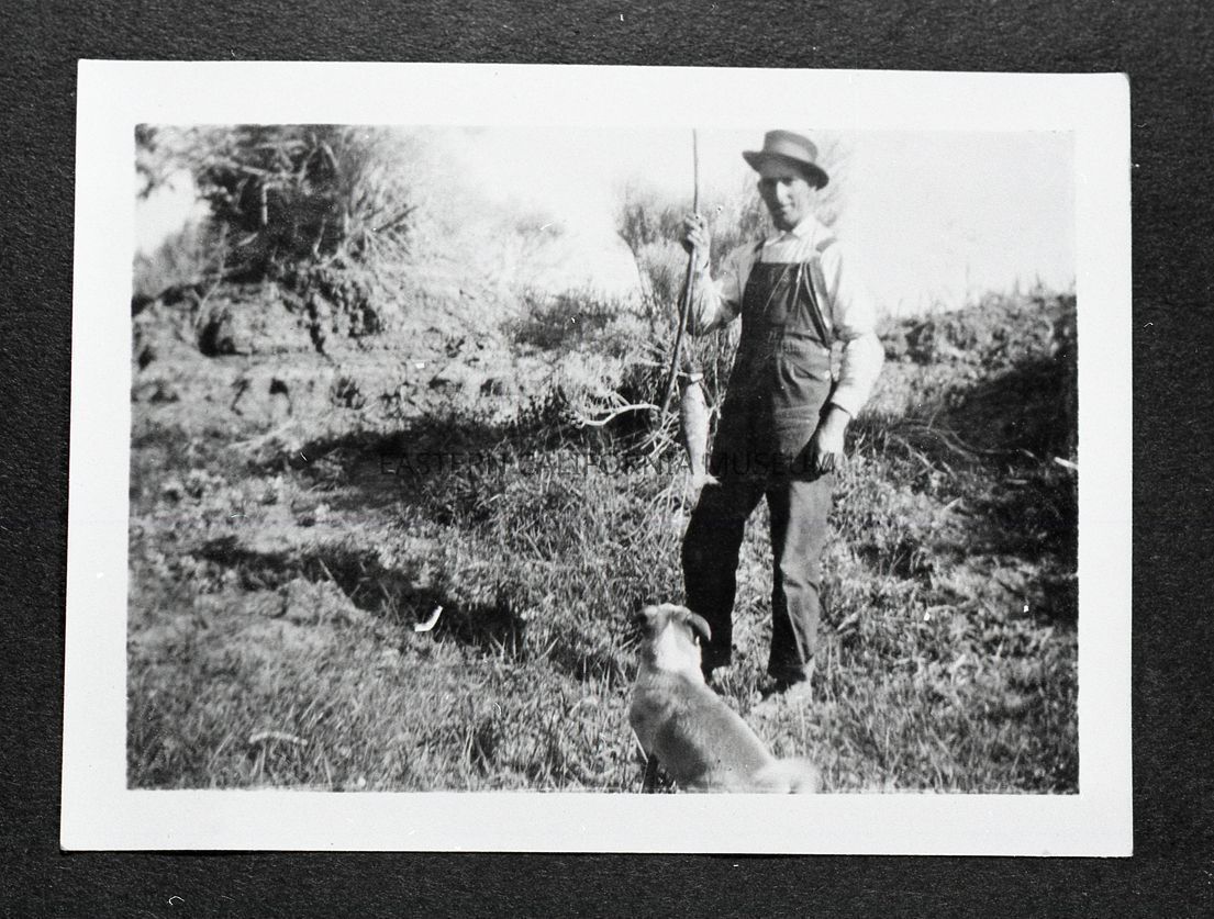 Photo taken of a photo in an album. It is of a man (likely Walter Levy) holding up a fish he caught on his fishing pole. There is a dog at his feet also looking at the fish.