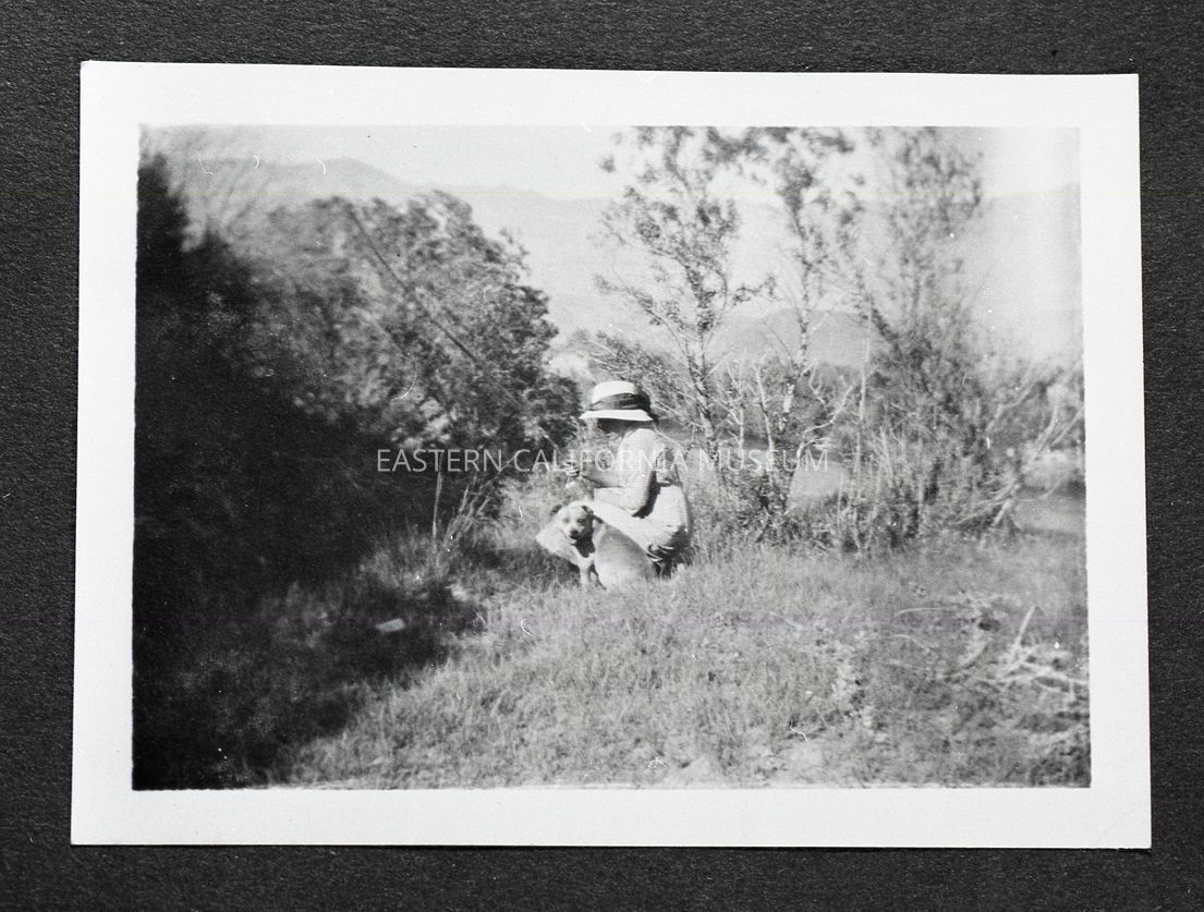 Photo taken of a photo in an album. It is of a woman (possibly Mary Levy?) fishing with a dog at her side.