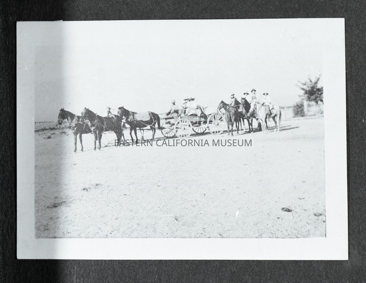 Photo taken of a photo in an album. It is of a four people on horseback and a group of people on a horse-drawn wagon (pulled by four horses). Written on the album page below the photo is, "Starting Out." The location may be Manzanar.