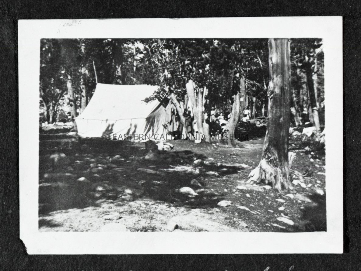 Photo taken of a photo in an album. It is of a white canvas tent set up amidst lots of trees. Written on the album page below the photo is, "Our Camp at the Lake."