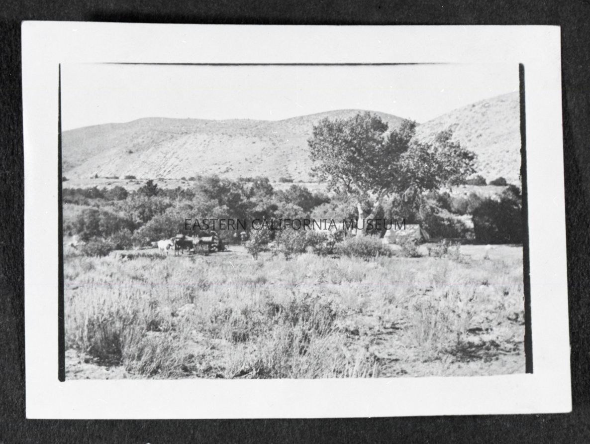 Photo taken of a photo in an album. It is of a couple white canvas tents set up under the shade of a tree. Horses are huddled together towards the left. Hills in the background. Written on the album page below the photo is, "Grey's Camp."