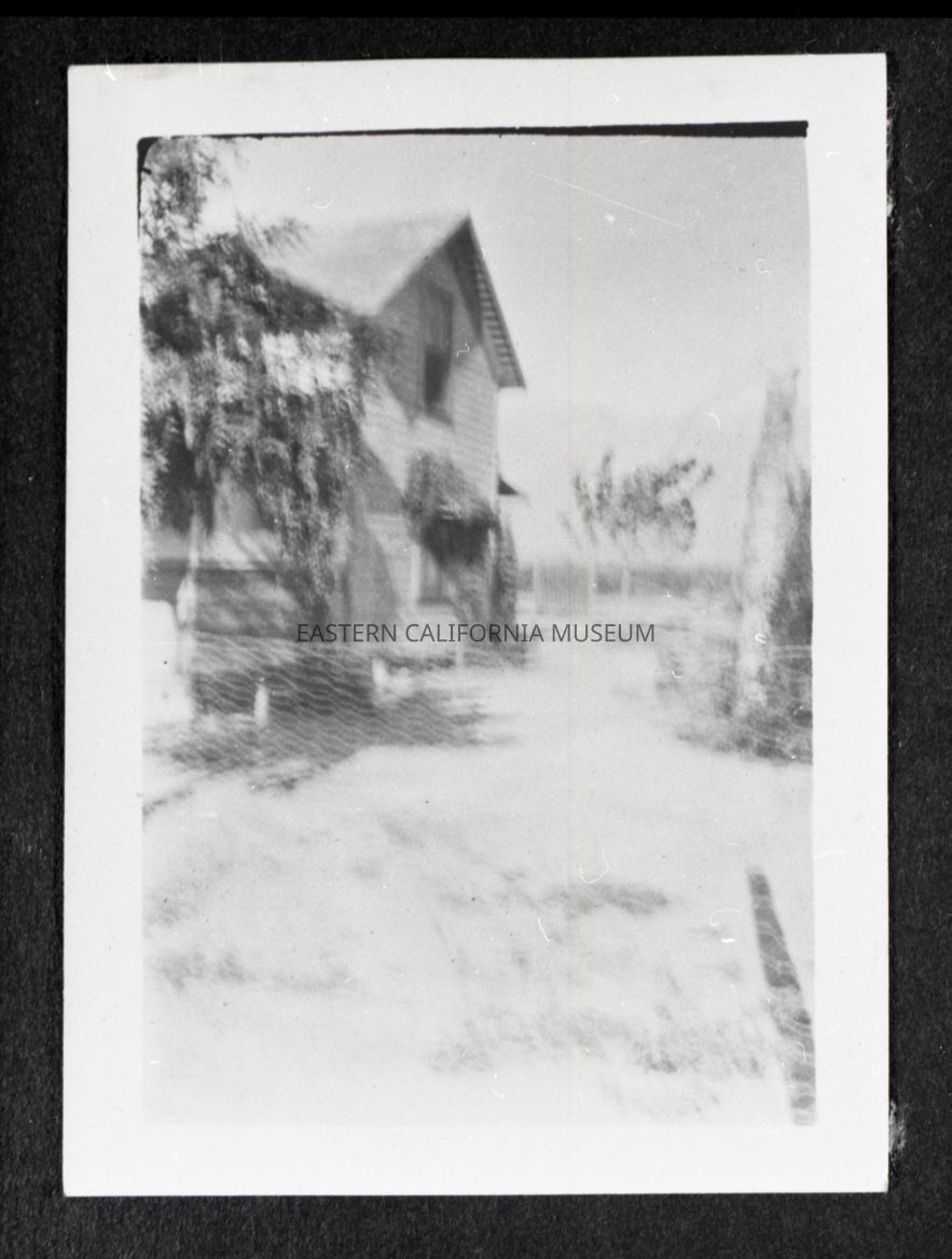 Photo taken of a photo in an album. It is a blurry photo of a two story house. Location may be Manzanar.