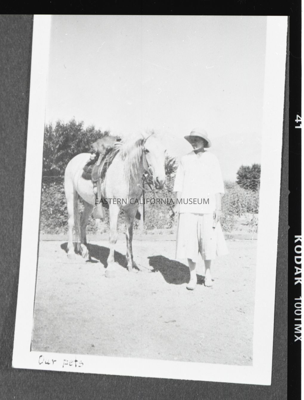 Photo taken of a photo in an album. It is of a woman in white standing next to a saddled white horse with a cat sitting in the saddle. Written along the bottom edge of the photo is, "Our pets." Location may be Manzanar.
