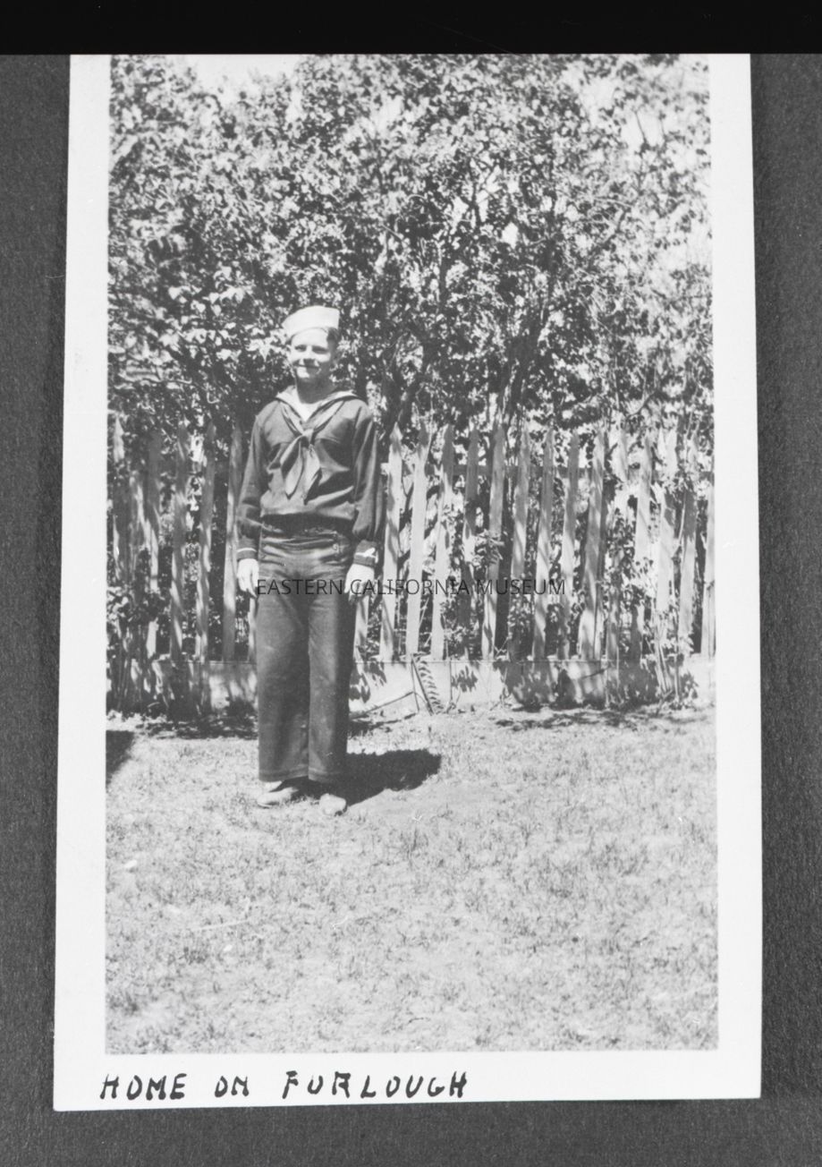 Photo taken of a photo in an album. It is of a young man in a sailor's uniform standing in front of a fence and bushes. Someone has written along the bottom edge of the photo, "Home on furlough."