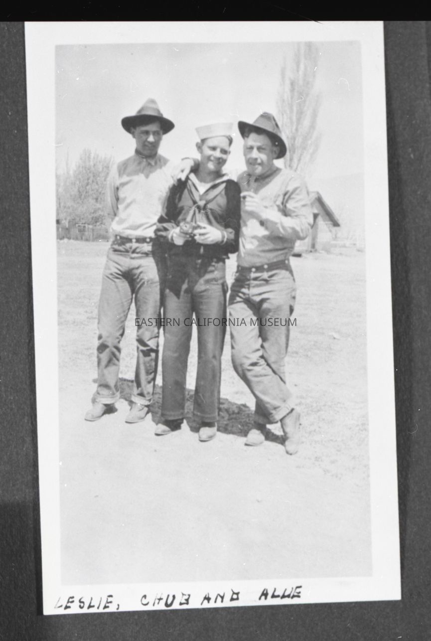 Photo taken of a photo in an album. It is of three men, the middle of which is wearing a sailor's uniform and holding something in his hands. The other two men look like cowboys or ranch hands. Someone has written along the bottom edge of the photo, "Leslie, Chub and Allie."