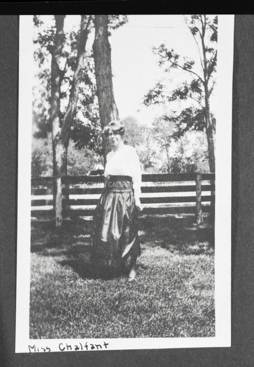 Photo taken of a photo in an album. It is of a woman standing in front of a horizontal fence with trees in the background. Someone has written along the bottom edge of the photo, "Miss Chalfant." [Blanche Chalfant?]