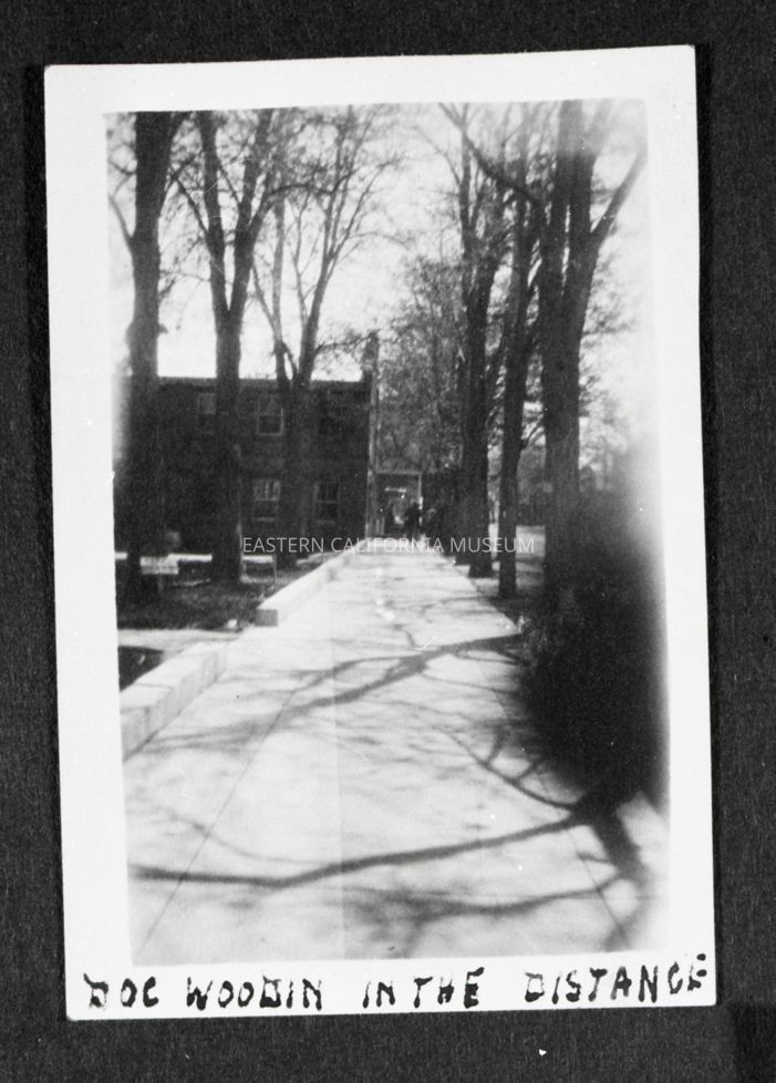 Photo taken of a photo in an album. It is of a nice walkway with a two story building in the distance. Trees line both sides of the path. Someone has written along the bottom edge of the photo, "Doc Woodin in the distance." Location may be along the Main Street (Edwards St.) in Independence.