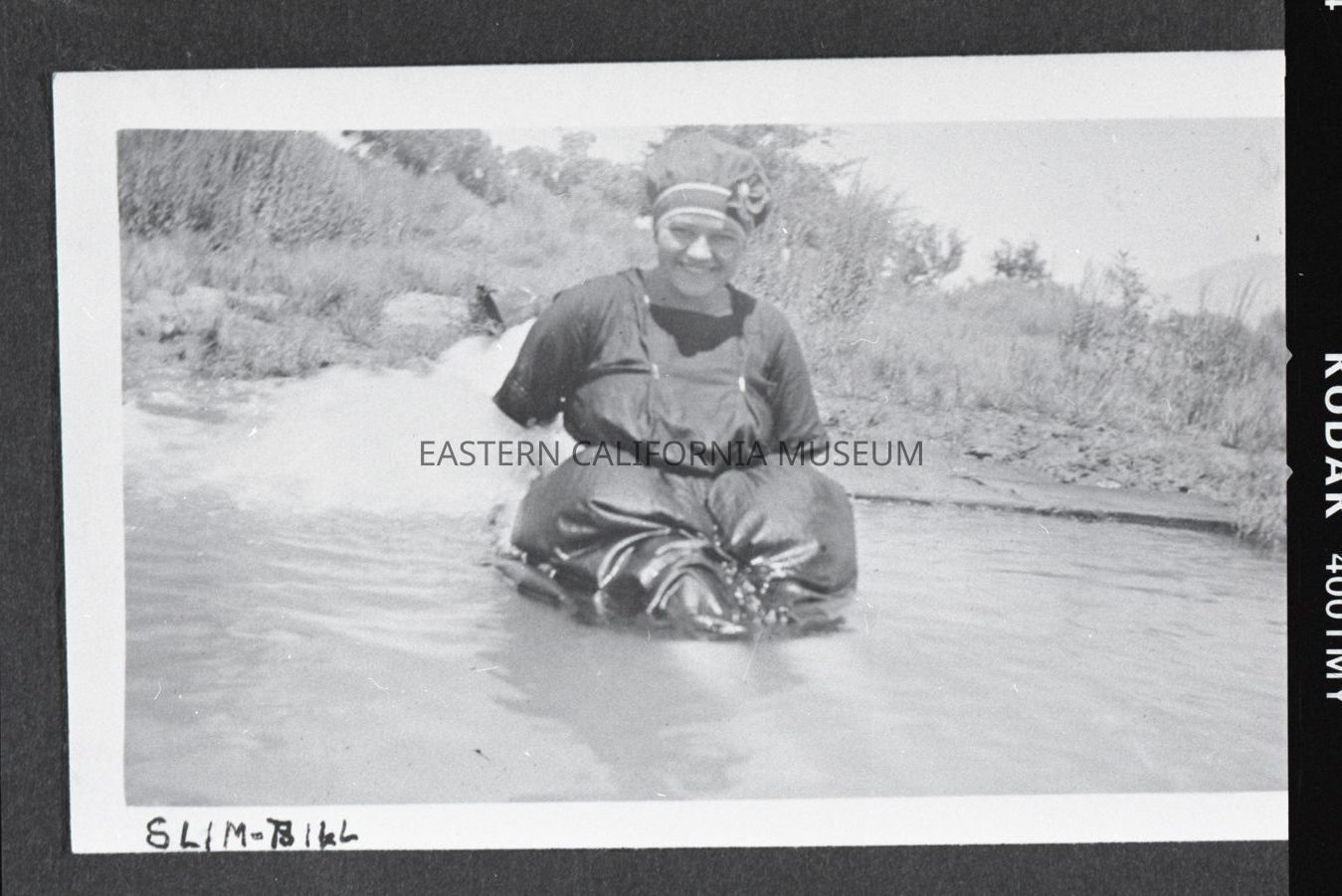 Photo taken of a photo in an album. It is of a woman sitting in a shallow pool, possibly an artesian well or reservoir. She has a bonnet-esque hat on, and may be wearing a swimming costume (or it's just a dark dress). Someone has written along the bottom edge of the photo, "Slim-Bill."