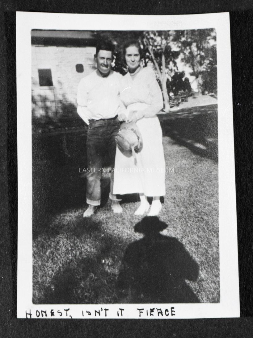 Photo taken of a photo in an album. It is of a man and woman standing in front of a stone building (possibly the third Courthouse in Independence?). Someone has written along the bottom edge of the photo, "Honest, isn't it fierce."