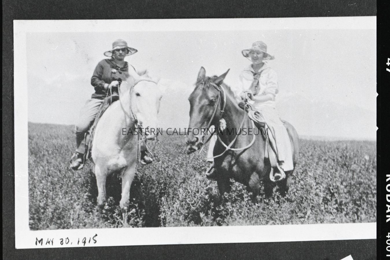 Photo taken of a photo in an album. It is of two women on horseback in a field (alfalfa?) with the Sierra Nevada mountain range in the far background. Someone has written along the bottom edge of the photo, "May 30, 1915."
