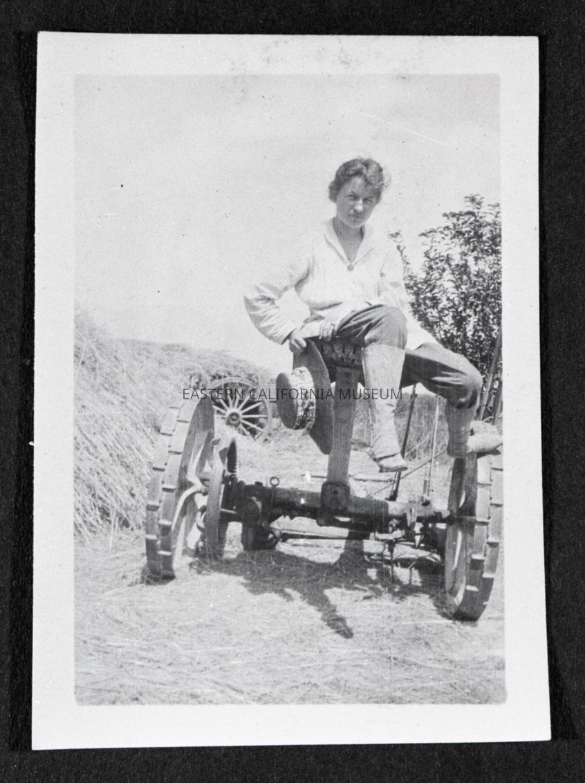 Photo taken of a photo in an album. It is of an unidentified person sitting on a piece of agricultural equipment with piles of hay beside and behind them. Location may be Manzanar.