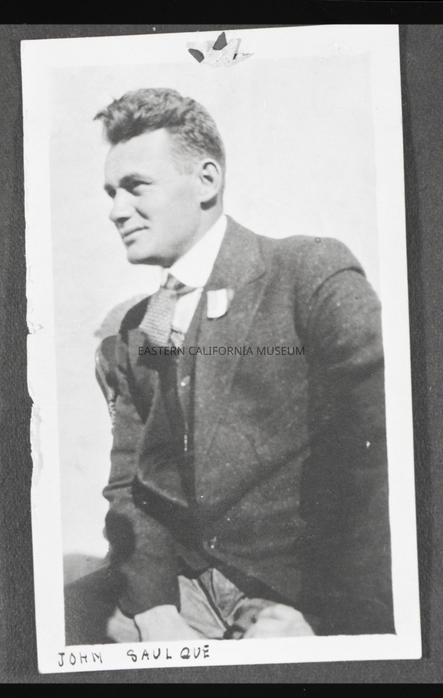 Photo taken of a photo in an album. It is a close up shot of a man in a suit sitting down. Somebody has placed a star sticker on the original photo. Someone has written along the bottom edge of the photo, "John Saulque."