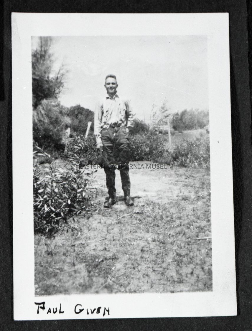 Photo taken of a photo in an album. It is of a man standing outside with bushes all around him. Someone has written along the bottom edge of the photo, "Paul Given."
