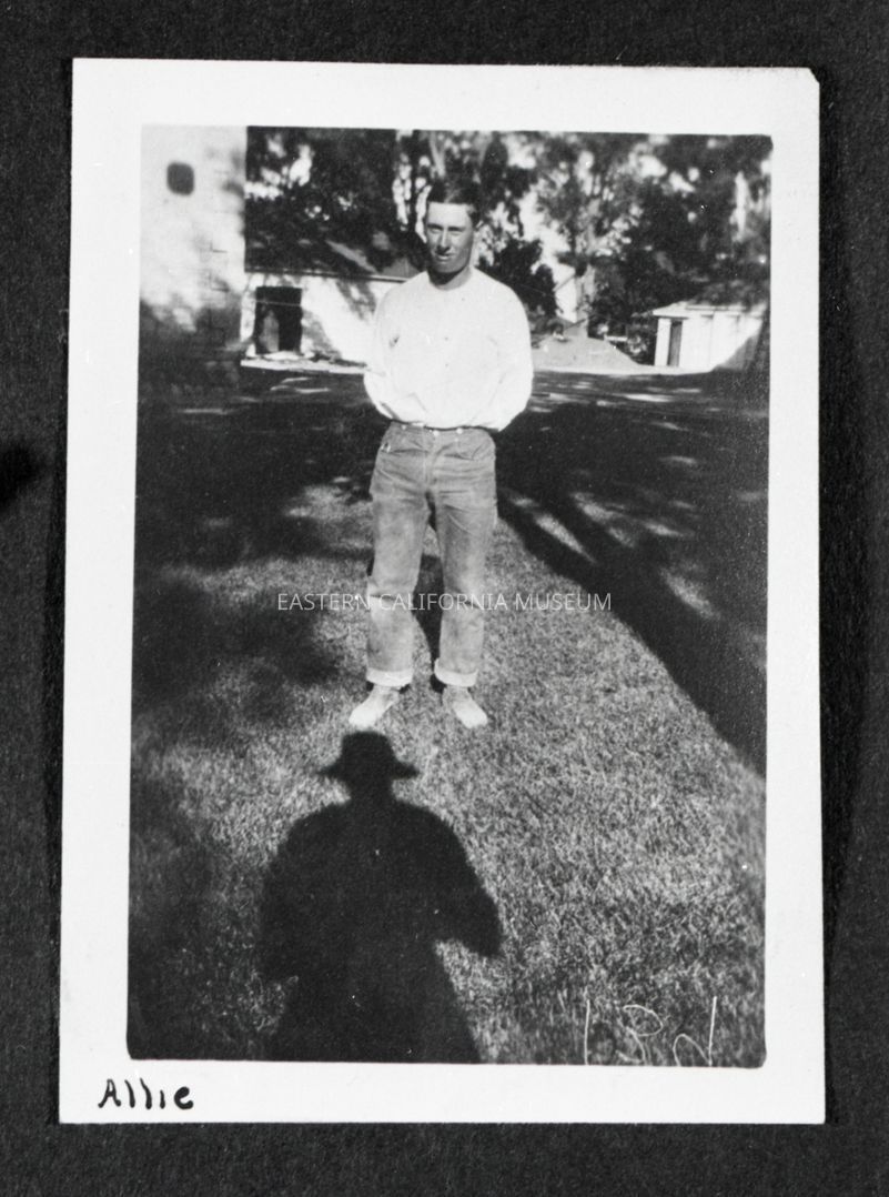 Photo taken of a photo in an album. It is of a man standing outside with what looks like stone buildings and trees behind him. Someone has written along the bottom edge of the photo, "Allie." Location may be Independence, and the structure on the left may be the third Courthouse.