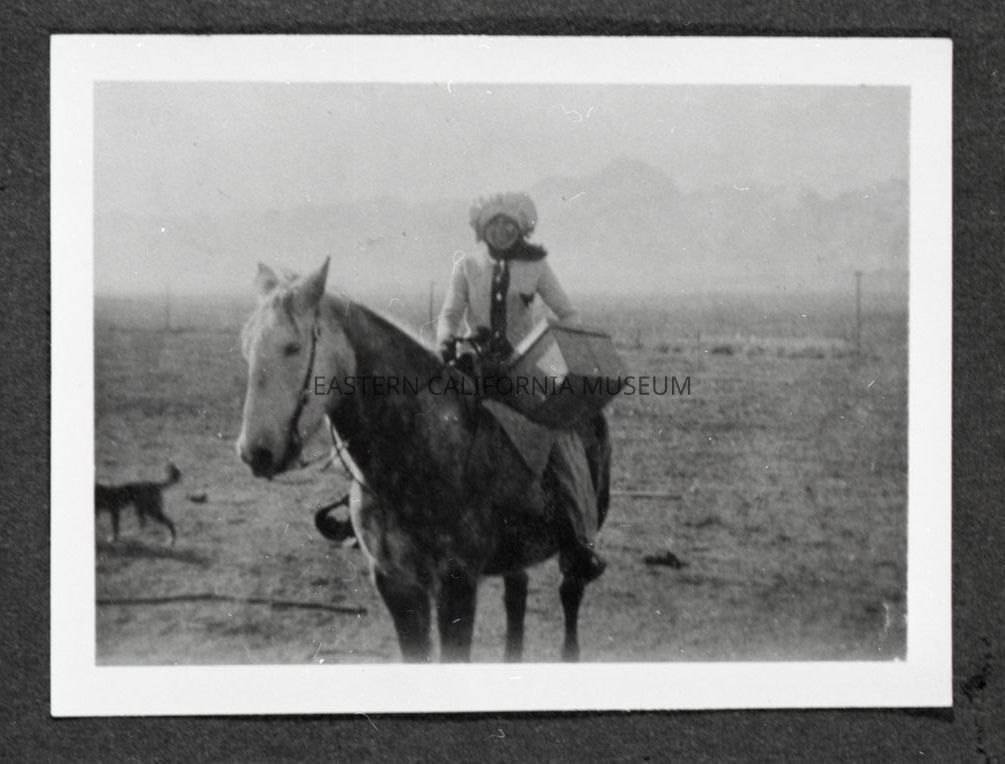 Photo taken of a photo in an album. It is of a woman (Minnie Singlaub Brooks?) on horseback with a large boxy parcel and a bonnet-esque hat. The Sierra Nevada mountain range is faintly visible in the background, and there is a dog cut off on the left side of the photo (maybe "Jim?")