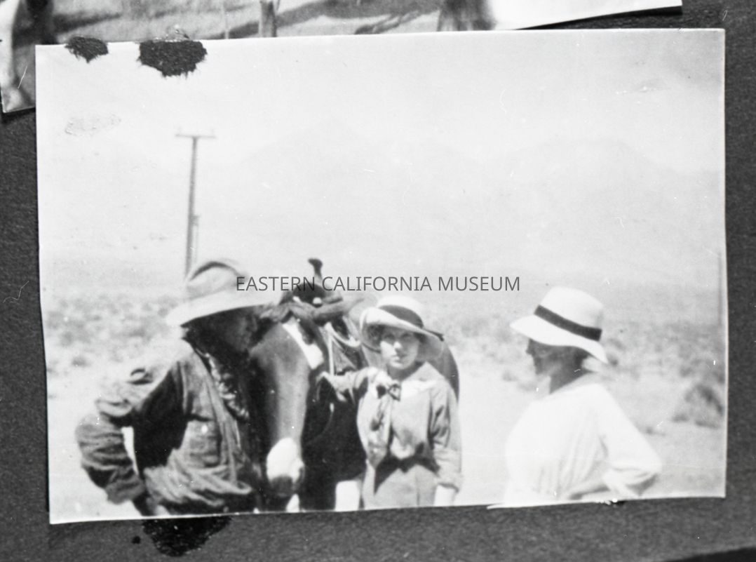 Photo taken of a photo in an album. It is of a man with two women. There is a saddle horse between them, a pole (telegraph? powerline?) in the background, and the faint outline of what may be the Sierra Nevada mountain range.