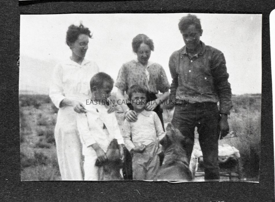 Photo taken of a photo in an album. It is of five people and two dogs. They are likely the three Singlaub siblings: Minnie Singlaub Brooks, Mary Singlaub Levy Gillespie, and John A. Singlaub. The two young boys are almost certainly Minnie's children: Phillips and Comet. The location may be Manzanar.
