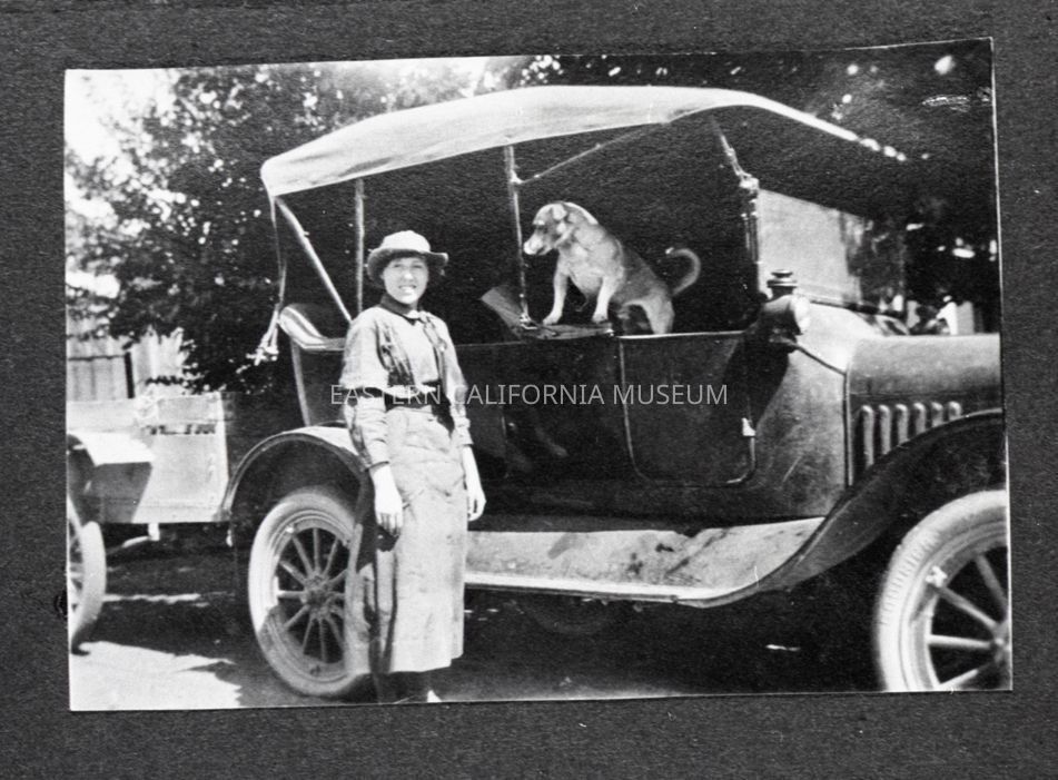 Photo taken of a photo in an album. It is of a woman (Mary Singlaub Levy Gillespie?) standing next to a dog in an early vehicle. The vehicle has a canvas or fabric covering and appears to be hauling a little trailer or wagon.