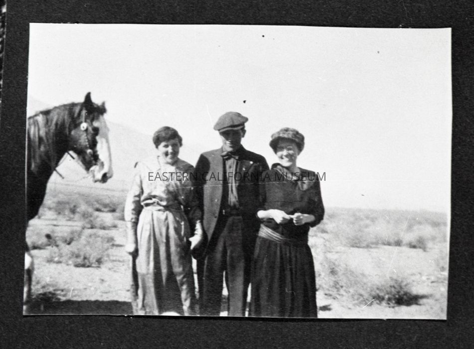 Photo taken of a photo in an album. It is of three people and a horse standing in the desert. They may be siblings Minnie Singlaub Brooks, Mary Singlaub Levy Gillespie, and John A. Singlaub. Location may be Manzanar.