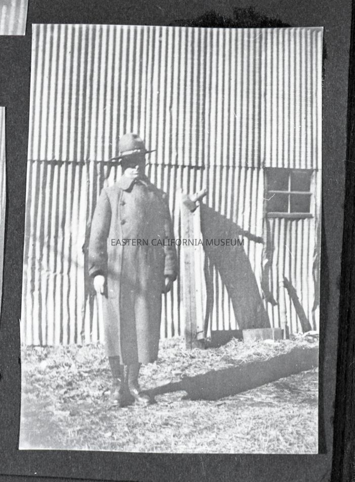 Photo taken of a photo in an album. It is of a man standing outside of a corrugated metal building. He is wearing a campaign hat and a long coat with calf-high boots.