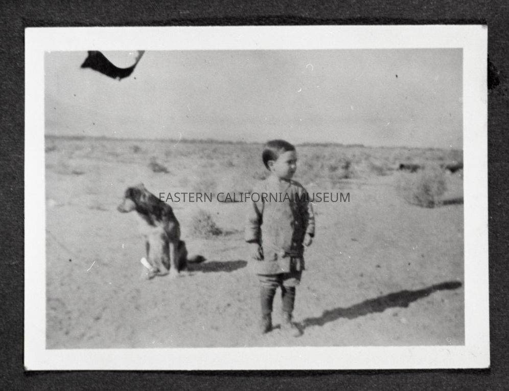 Photo taken of a photo in an album. It is of a little boy and dog in the desert. The little boy is likely either Phillips or Comet Brooks, the sons of Minnie Singlaub Brooks. The dog might be "Jim."