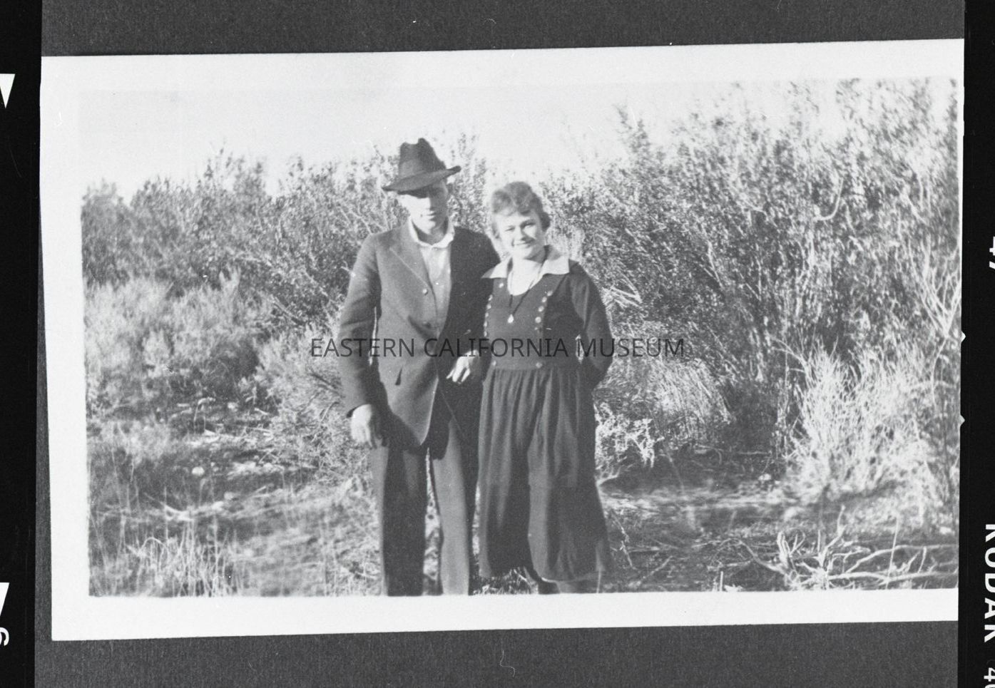 Photo taken of a photo in an album. It is of a man and woman standing outside. There is a lot of bushes and brush behind them.