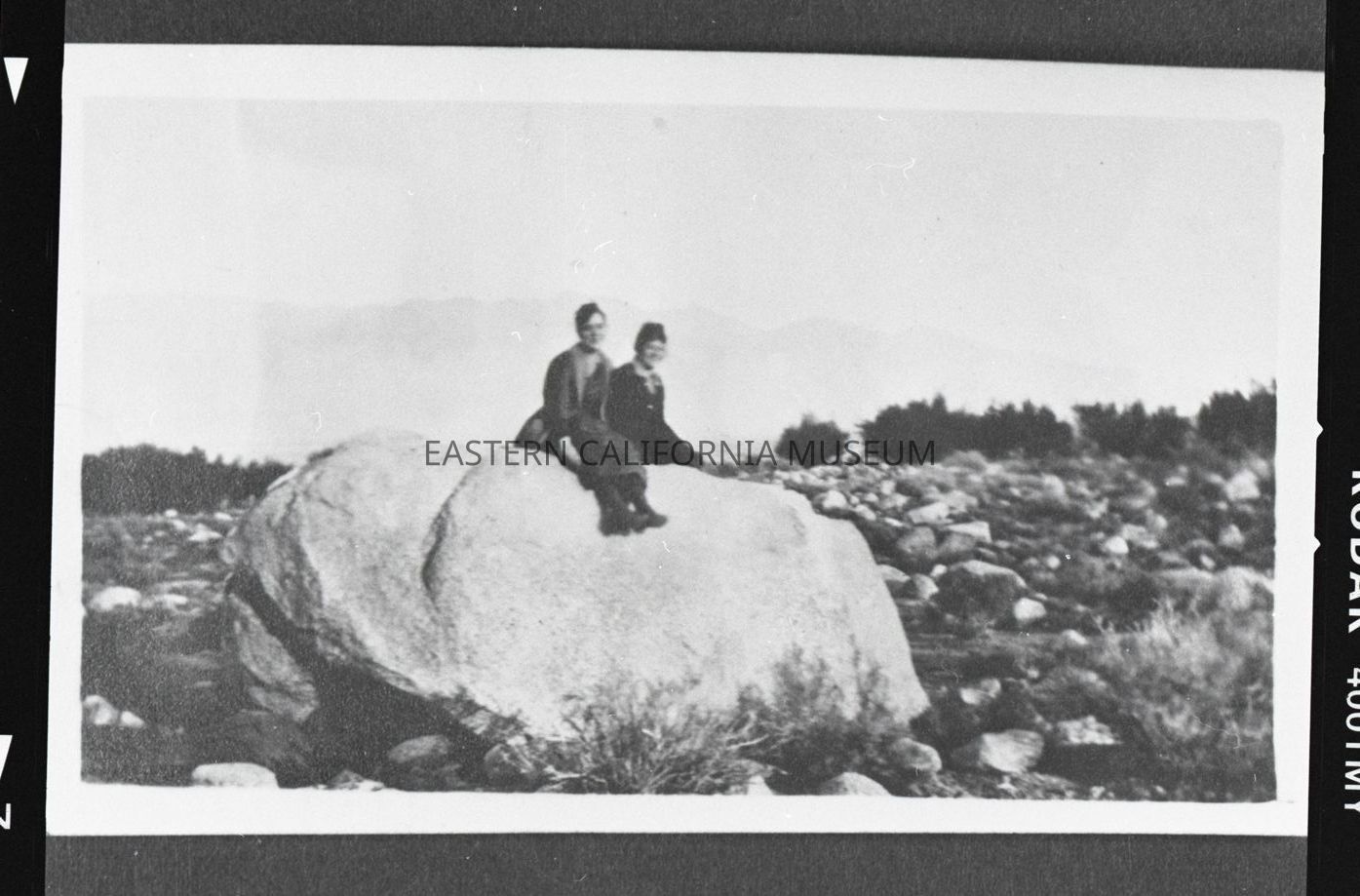 Photo taken of a photo in an album. It is of two people sitting on a very large boulder. The faint outline of mountains are visible in the background.